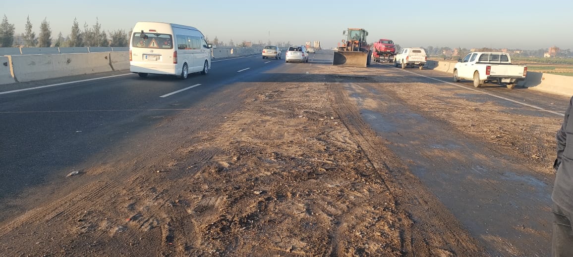 تجدر الإشارة إلى أن سيارة نقل محملة بعلب سمن كانت قد انقلبت على الطريق، وعلى الفور وجه المحافظ رئيس مدينة بنها بتوفير لودر محمل بالرمل من أجل التعامل مع تلك العلب، وبالفعل تم رفع أثار تلك السمن الملقي على الطريق.