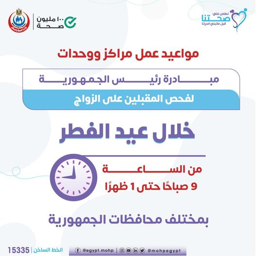 أعلنت وزارة الصحة والسكان عن موعد عمل مراكز ووحدات مبادرة رئيس الجمهورية لفحص المقبلين على الزواج خلال عيد الفطر.