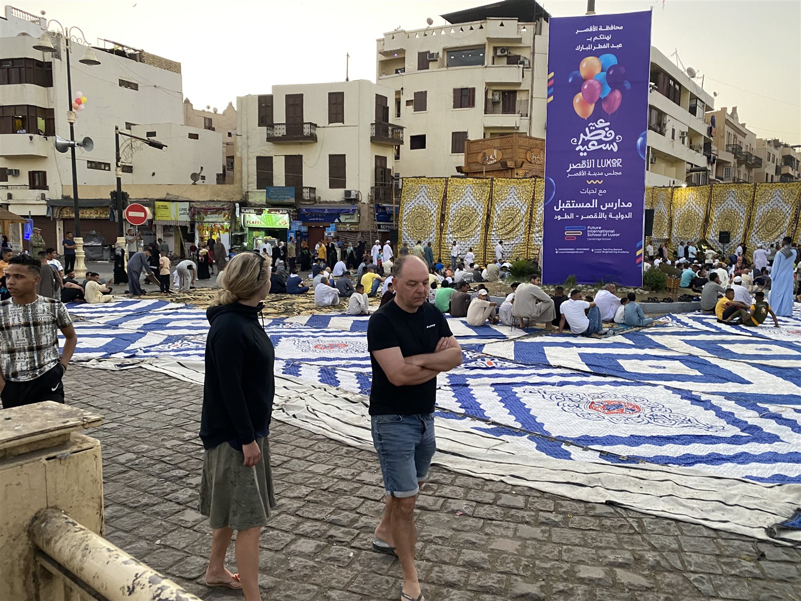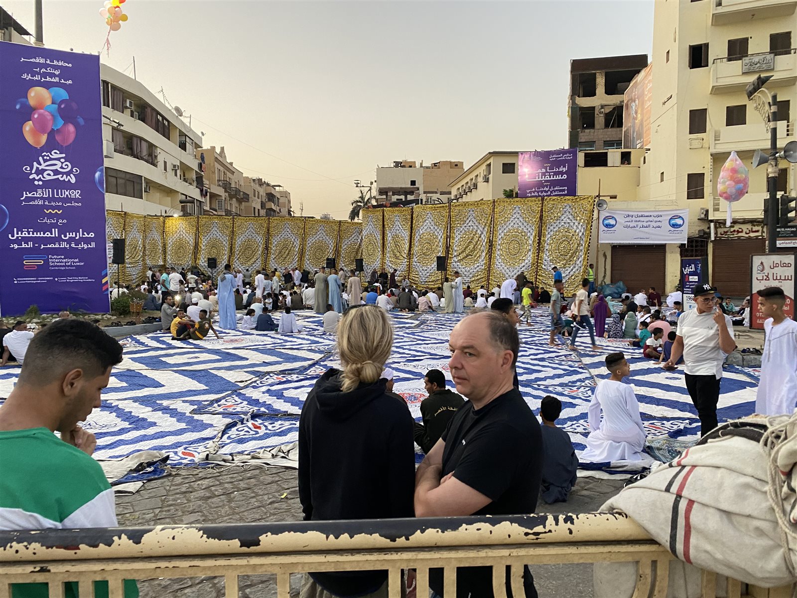 شاركت مجموعة من السائحين من مختلف الجنسيات أهالي الأقصر فرحتهم بالعيد في التواجد مبكرا بساحة سيدي أبا الحجاج حيث أقيمت صلاة العيد.