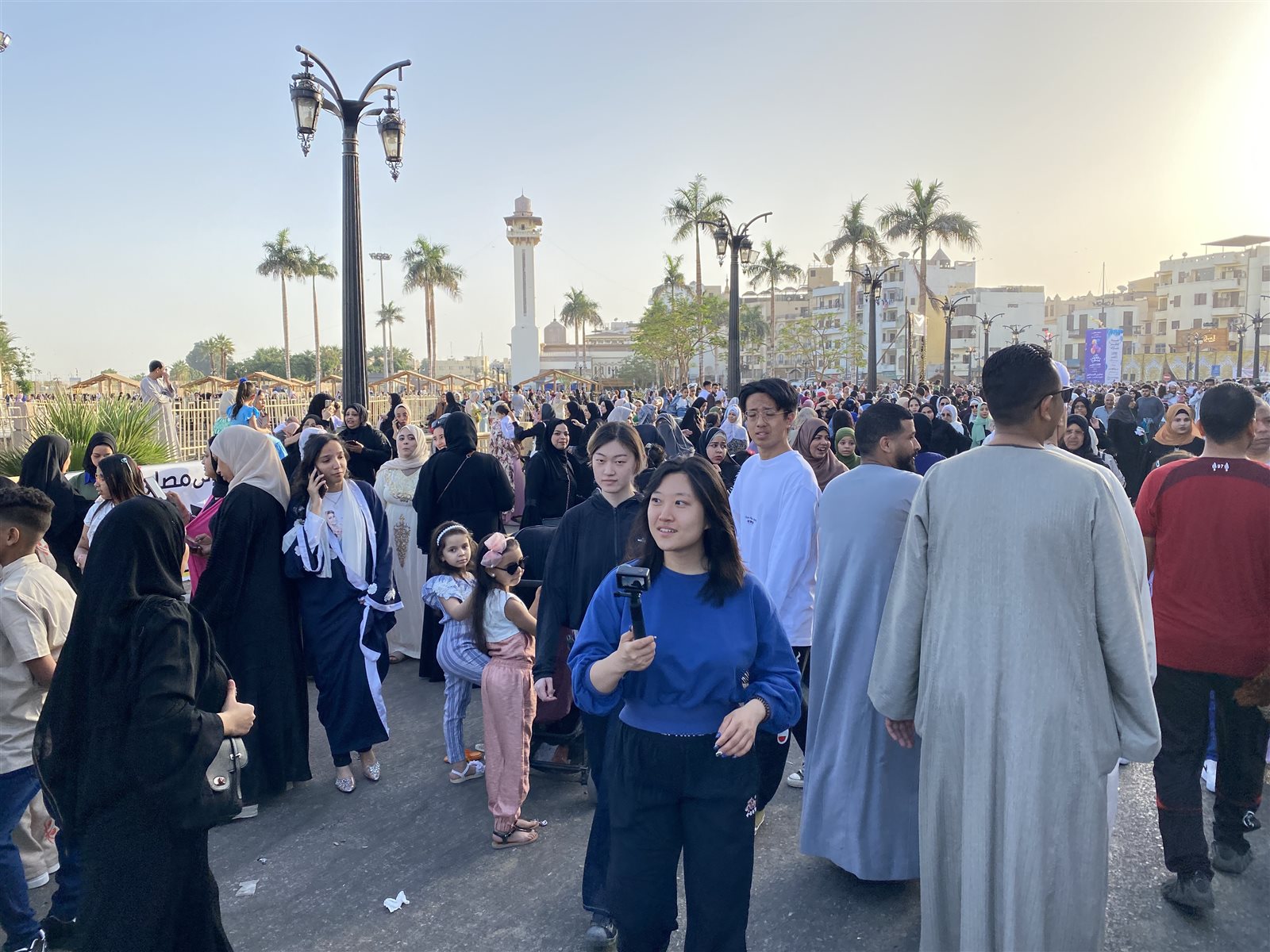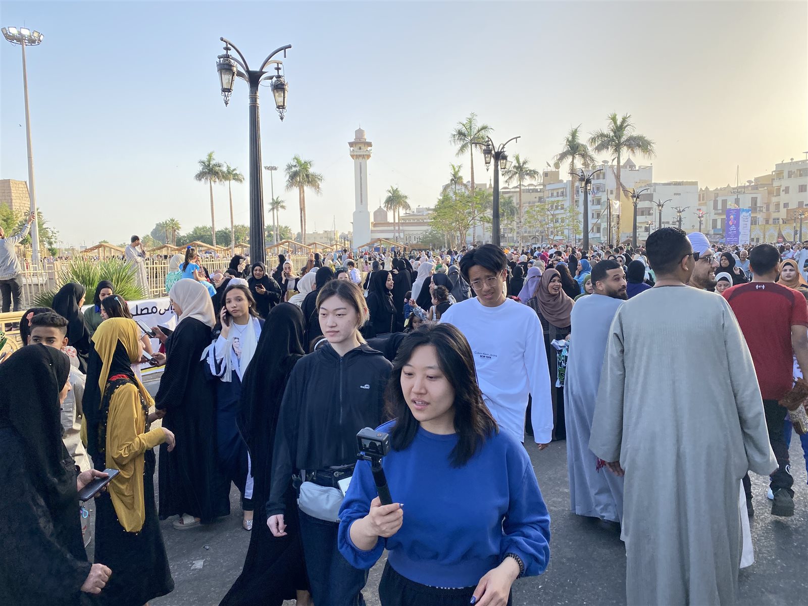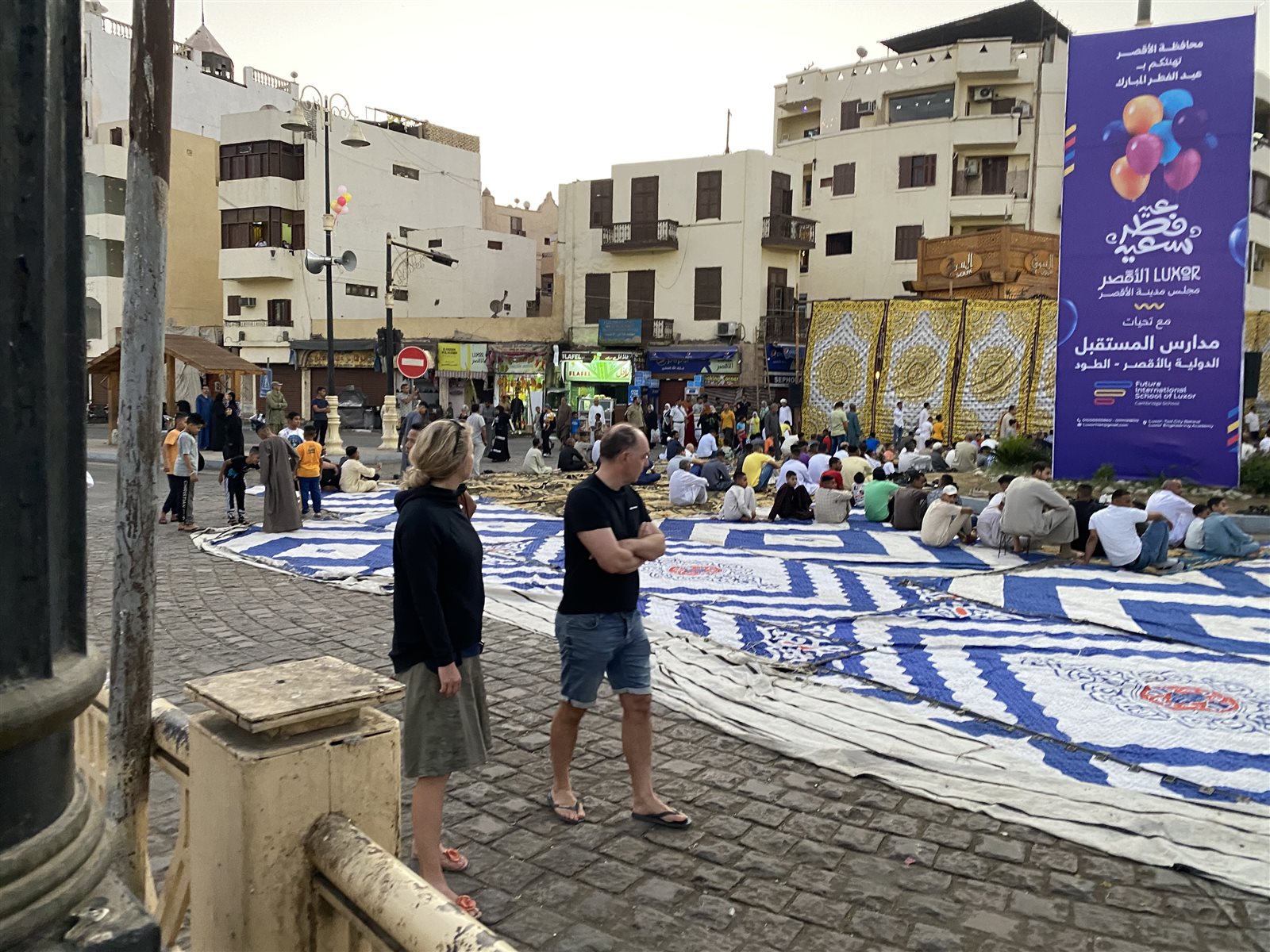سائحون يشاركون أهالي الأقصر فرحتهم بعيد الفطر بالتواجد في ساحة الصلاة