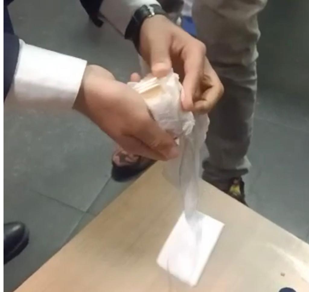 وبتفتيش حقائبه على جهاز الفحص بالأشعة بواسطة كل من محمد حميدة مأمور الجمرك ومحمد عبد المنعم صالح رئيس القسم واللذان تلاحظ لهما وجود كثافات معتمة داخل حقائب الراكب، قام إبراهيم عامر مدير الحركة المشرف على صالة الوصول بمبني الركاب رقم 3 بتكليف الدكتور مؤمن حسن مأمور الجمرك بتفتيش حقائب الراكب يدويا والذي تلاحظ له وجود فواتير شراء من محلات الذهب، قام الدكتور صابر عبد الحميد مدير الجمرك بتكليف الدكتور مؤمن حسن بتفتيش الراكب ذاتيا مما اسفر عن ضبط كمية من السبائك الذهبية أخفاها الراكب داخل جيب سحري أسفل ملابسه الداخلية السفلية، قامت لجنة مشكلة من محمد نبيل طلب ومحمد فتح الله ومؤمن حسن مآمير الجمرك في حضور محمد سيد خليل وإسلام ربيعي من إدارة الامن الجمركي، وذلك لجرد ووزن وتحريز المضبوطات والتي بلغ عددها ستة سبائك ذهبية وزنها كيلو وخمسين جرام.