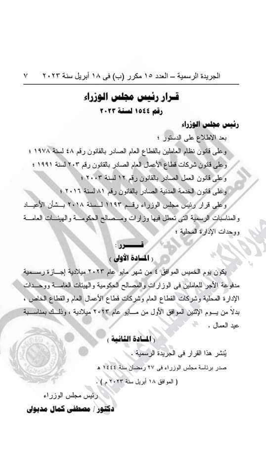 الإجازة الوحيدة في شهر مايو، هي إجازة عيد العمال 2023 والتي يتزامن موعدها يوم الاثنين الموافق 1 مايو 2023، إلا أنه وفقا لقرار مجلس الوزراء المصري فقد تم ترحيل إجازة عيد العمال إلى يوم الخميس المقبل الموافق 4 مايو 2023.