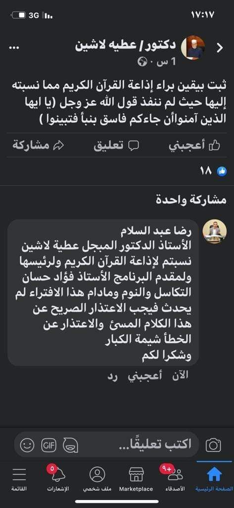 رئيس إذاعة القرآن الكريم يطالب عطية لاشين بالاعتذار عن إهانته للإذاعة ويفاجأ بحذف تعليقه