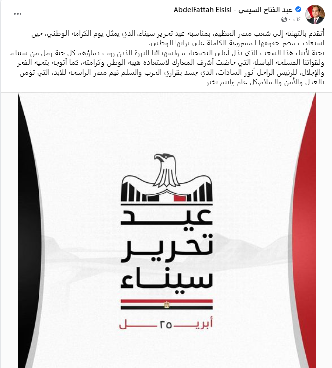 وقال السيسي في تدوينة عبر حسابه الرسمي بـ فيس بوك: أتقدم بالتهنئة إلى شعب مصر العظيم، بمناسبة عيد تحرير سيناء، الذي يمثل يوم الكرامة الوطني، حين استعادت مصر حقوقها المشروعة الكاملة على ترابها الوطني.
