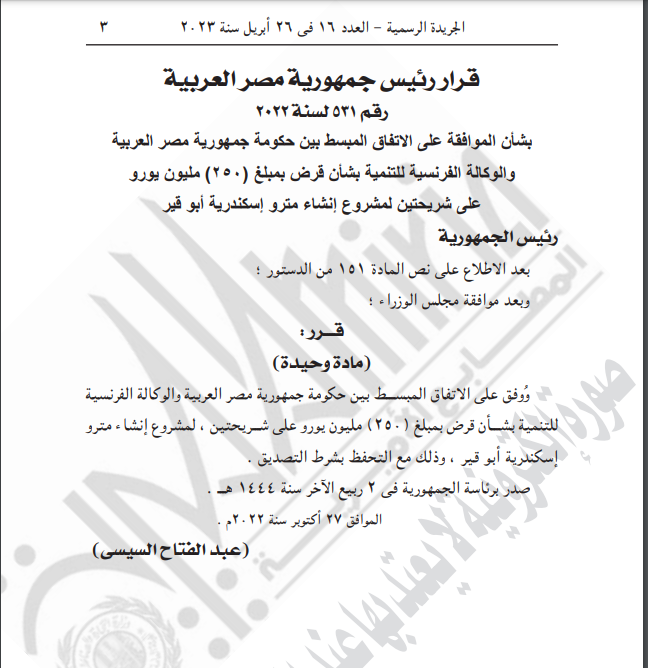 وأفادت الجريدة الرسمية في مادتها الأولى، بأنه وفقًا لـ الاتفاق المبسط بين حكومة جمهورية مصر العربية، والوكالة الفرنسية للتنمية بشأن قرض بمبلغ 250 مليون يورو على شريحتين، لمشروع إنشاء مترو إسكندرية أبو قير، وذلك مع التحفظ بشرط التصديق.