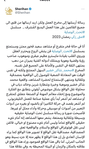 واختتمت شريهان: كتيبة عمل مؤمنة بما تفعل وتعمل وتقوم به، تحضير تنفيذ حب إتقان واجتهاد، أبطال جميعكم أبطال.. وشكرًا لقائد العمل المخرج محمد شاكر خضير، شاكر ابني وصديقي ومبدعي المحترم من فضلك وأرجوك إبدع وإبدع وإبدع كتير واكتب تاريخ فني مصري عظيم.