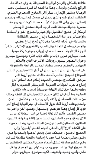 وأردفت شريهان: الموسيقى التصويرية ليال وطفة، وكلمة حق، تيتتر النهاية موسيقيًا يُدرس، ولم يكتفي المخرج بما أبدع في إتقان جميع التفاصيل في كل لقطة وحلقة من حلقات المسلسل ولكنه يأتي ويضيف مجددًا مع الملحن واستديوهات أروما أثناء نزول الأسماء في تيتر النهاية إبداع أخر فوق كل إبداع وهذا هو عدم الاستسهال وعشق الفن واحترامه بمنتهي الضمير وأكرر كل نوتة لحنية في تيتر النهاية تُدرس، الكل يبدع، جميع العاملين، المساعدين إنتاج وإخراج، الفنيين، الفنانين، الممثلين المبدعين من الطفلة الموهوبة المحمولة على الكتف فرح إلى الطفل النجم القادم ياسين وإلى الجميع الجميع، جميعكم بطل ونجم أبدعتوا وأسعدتوا عيني وقلبي وعقلي بمتعة فنية بصرية إبداعية واقعية عظيمة تشرف، وكم مشاعر صادقة نستنى أسماء جميع الممثلين الحقيقيين، تناغم وإجتهاد وعدم غرور وحب واحترام بين الجميع، والكل ذاكر، وأمن، وحب، واجتهد.. فكرة، موضوع، سيناريو، حوار، توظيف حركة الممثل لتوصيل المعلومة لحضرة المتفرج، أداء، موسيقى تصويرية، مدير تصوير، إضاءة، ملابس، اكسسوارات، أماكن تصوير، تحضير، مساعدين، مجاميع،، أدوار ثانية، ممثلين ونجمة جميلة رائعة مبدعة.