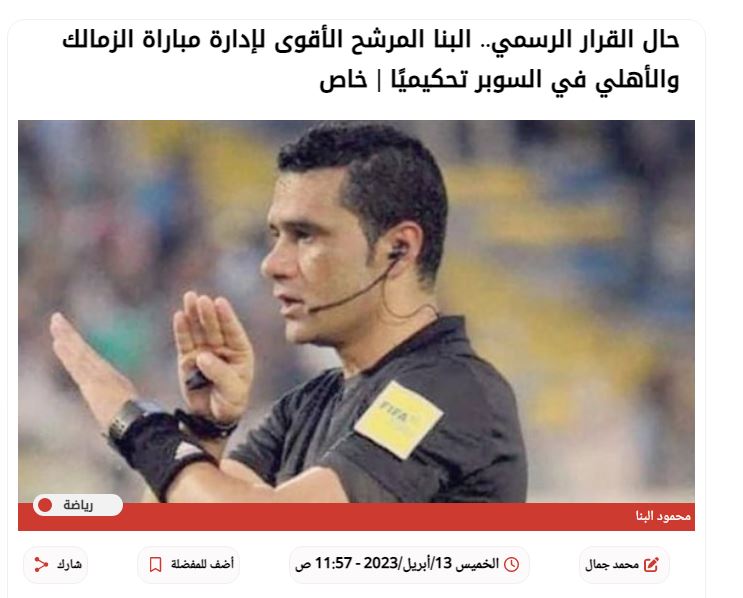 يأتي ذلك تأكيدًا لـ القاهرة 24 حيث انفردنا منذ أكثر من 15 يومًا أن لجنة الحكام استقرت علي تعيين محمود البنا في حال الاتفاق علي وجود حكم مصري لقيادة السوبر.