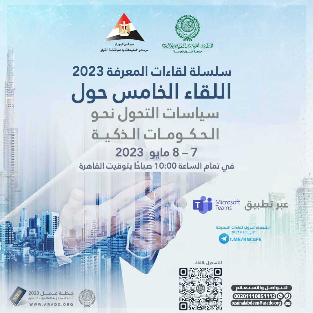 أعلن مركز المعلومات ودعم اتخاذ القرار بـ مجلس الوزراء، عن تنظيم فعالية مشتركة مع المنظمة العربية للتنمية الإدارية، تتمثل في سلسلة لقاءات المعرفة 2023 وذلك خلال الفترة (7-8) مايو 2023 والتي ستناقش هذا العام موضوع التحول نحو الحكومات الذكية.