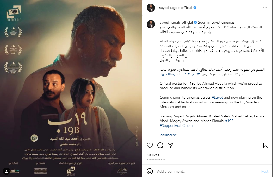 ونشر الفنان سيد رجب عبر حسابه الشخصي على موقع تبادل الصور والفيديوهات انستجرام بوستر فيلم 19 ب، ليعلن عرض العمل في السينما.