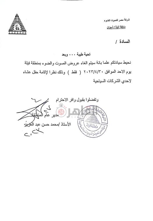 أعلنت شركة الصوت والضوء إلغاء عروضها في منطقة معبد فيلة بأسوان يوم الأحد المقبل الموافق 30-4-2023 وذلك نظرًا لإقامة حفل عشاء لإحدى الشركات السياحية.