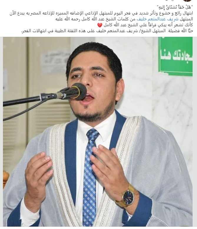 وفي هذا الصدد، كتب شاب يدعى يوسف عبده، منشورًا عبر صفحته الشخصية بموقع التواصل الاجتماعي فيسبوك: "هَلْ حَقًا تَشتَاقُ إِليهِ".. ابتهال رائع وخشوع وتأثر شديد في فجر اليوم للمبتهل الإذاعي الإضافه المميزه للإذاعة المصريه يبدع الآن المبتهل شريف خليف، من كلمات الشيخ عبد الله كامل رحمه الله عليه.. كأنك تشعر أنه يبكي فراقا على الشيخ عبد الله كامل.. حيَّا الله فضيلة المبتهل الشيخ شريف عبدالمنعم خليف على هذه اللفتة الطيبة في ابتهالات الفجر.