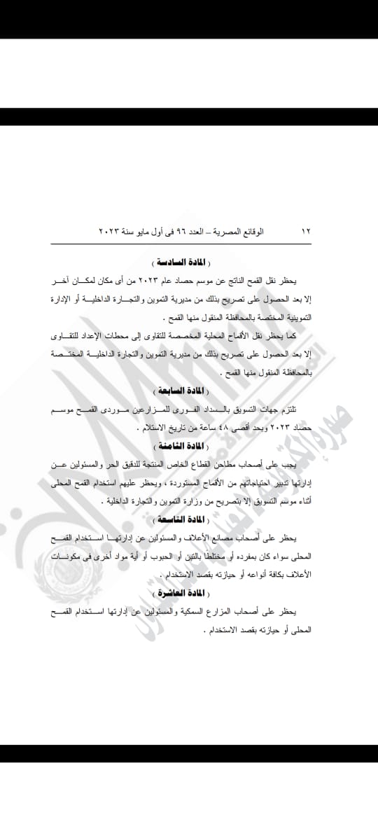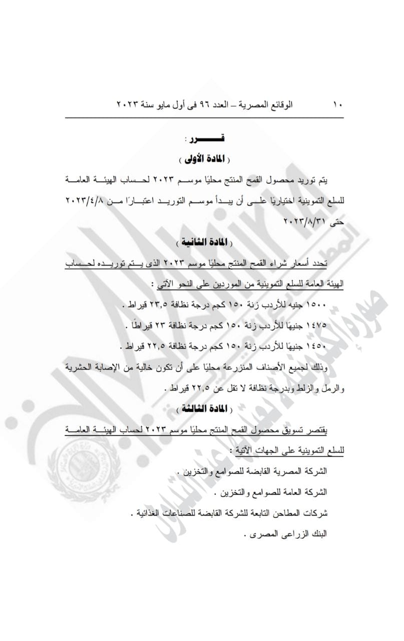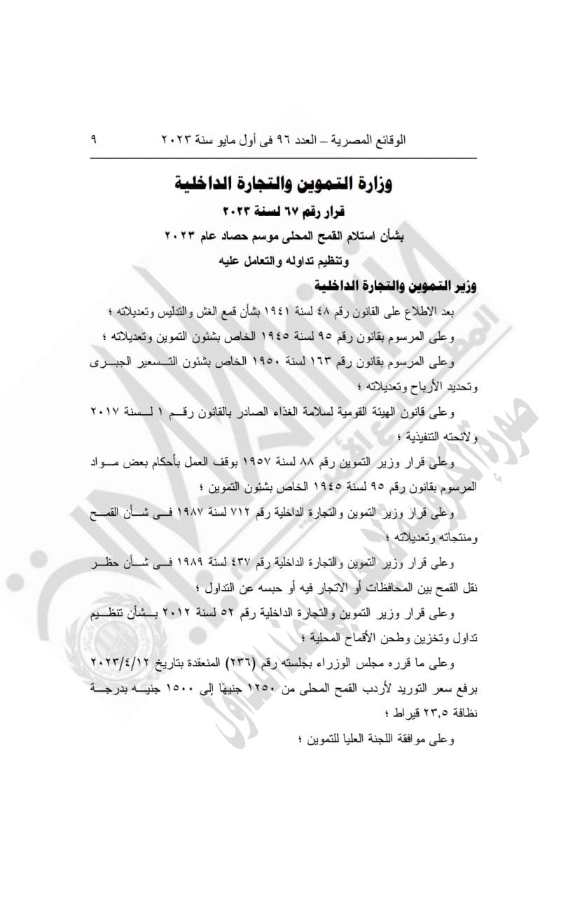 نشرت الجريدة الرسمية، قرار وزارة التموين والتجارة الداخلية رقم 67 لسنة 2023، بشأن استلام القمح المحلي موسم حصاد عام 2023 وتنظيم تداوله والتعامل عليه.