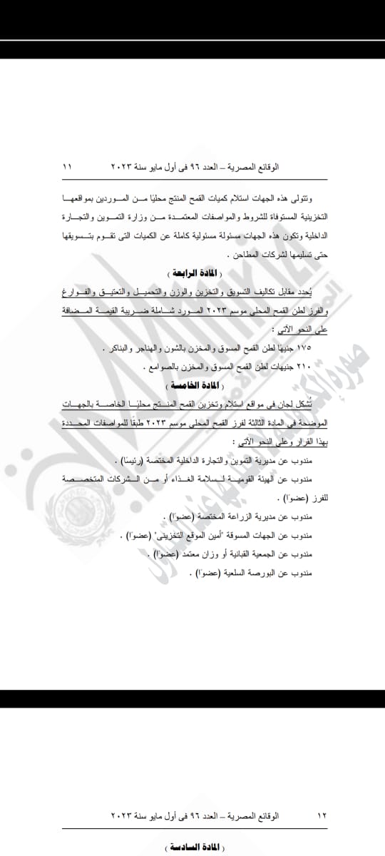 تشكل لجان في مواقع استلام وتخزين القمح المنتج محليا الخاصة بالجهات الموضحة في المادة الثالثة لفرز القمح المحلى موسم 2023 طبقا للمواصفات المحددة