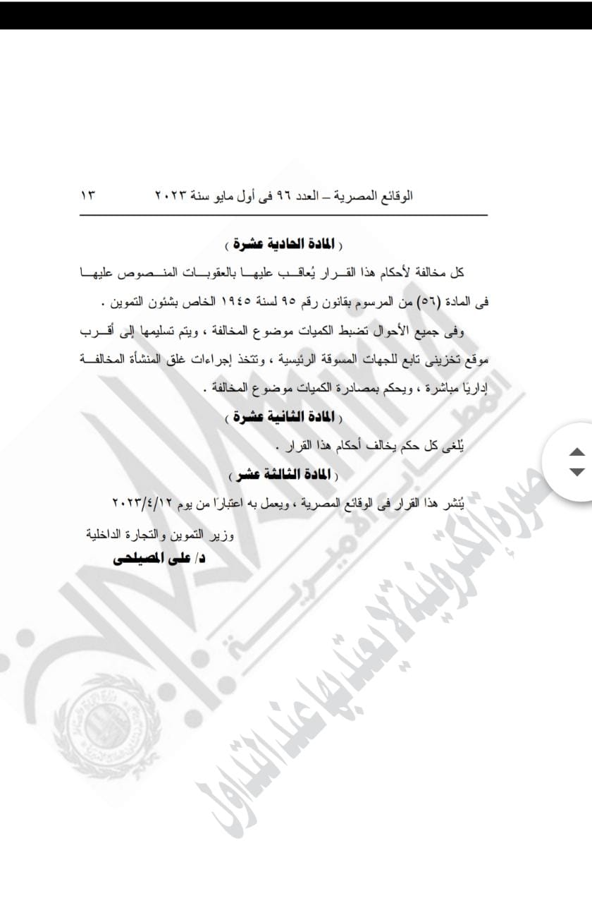 وأوضح قرار وزارة التموين والتحارة الداخلية، أنه بعد الاطلاع على القانون رقم 48 لسنة 1941 بشأن قمع الغش والتدليس وتعديلاته؛ وعلى المرسوم بقانون رقم 95 لسنة 1954 الخاص بشئون التموين وتعديلاته؛ وعلى المرسوم بقانون رقم 163 لسنة 1950 الخاص بشئون التسعير الجبرى وتحديد الأرباح وتعديلاته ؛ وعلى قانون الهيئة القومية لسلامة الغذاء الصادر بالقانون رقم لسنة 2017، ولائحته التنفيذية، على قرار وزير التموين رقم 88 لسنة1957 بوقف العمل بأحكام بعض مـواد المرسوم بقانون رقم 95 لسنة 1945 الخاص بشئون التموين؛ وعلى قرار وزير التموين والتجارة الداخلية رقم 712 لسنة 1987 في شأن القمح ومنتجاته وتعديلاته وعلى ما قرره مجلس الوزراء بجلسته رقم (236) المنعقدة بتاريخ 12 أبريل 2023، برفع سعر التوريد لأردب القمح المحلى من 1250 جنيها إلى 1500 جنيه بدرجة نظافة 23.5 قيراط، وعلى موافقة اللجنة العليا للتموين يتم ما يلي: