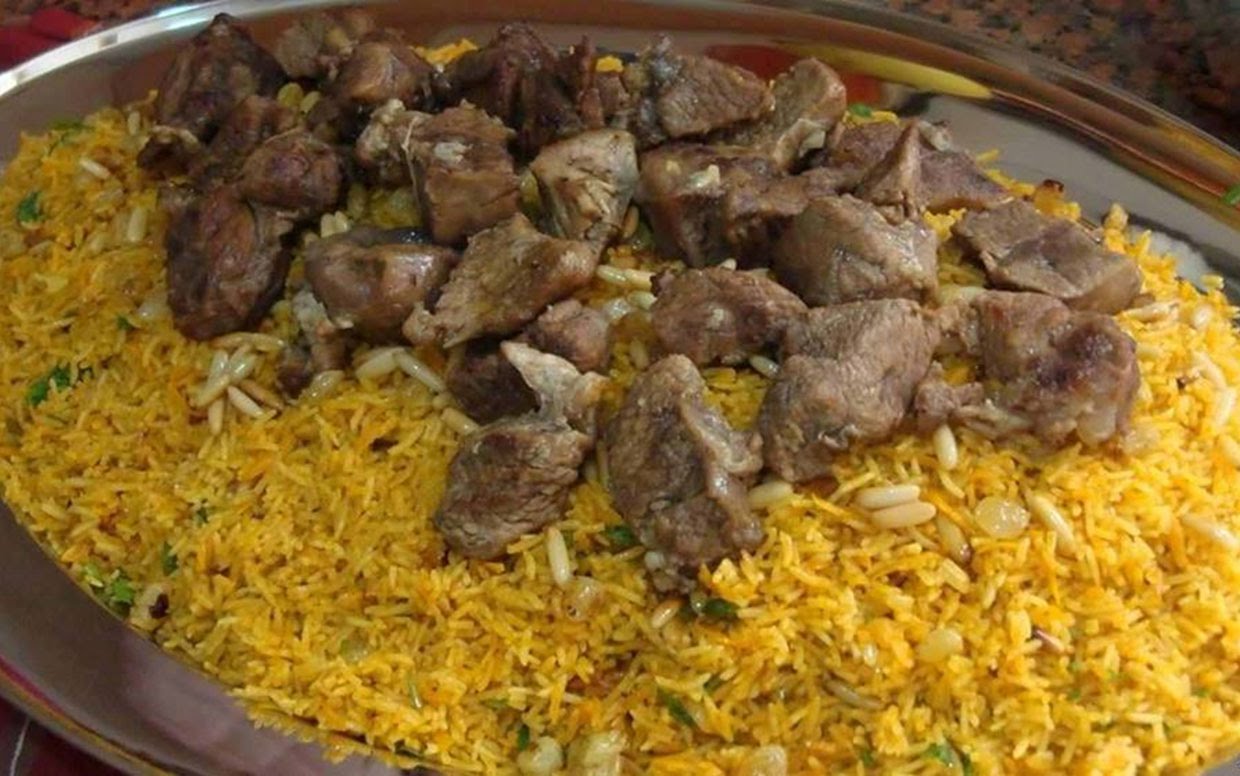 - الآن يوضع الأرز في طبق ويوضع عليه قطع لحم الماعز وبألف هنا وشفا
