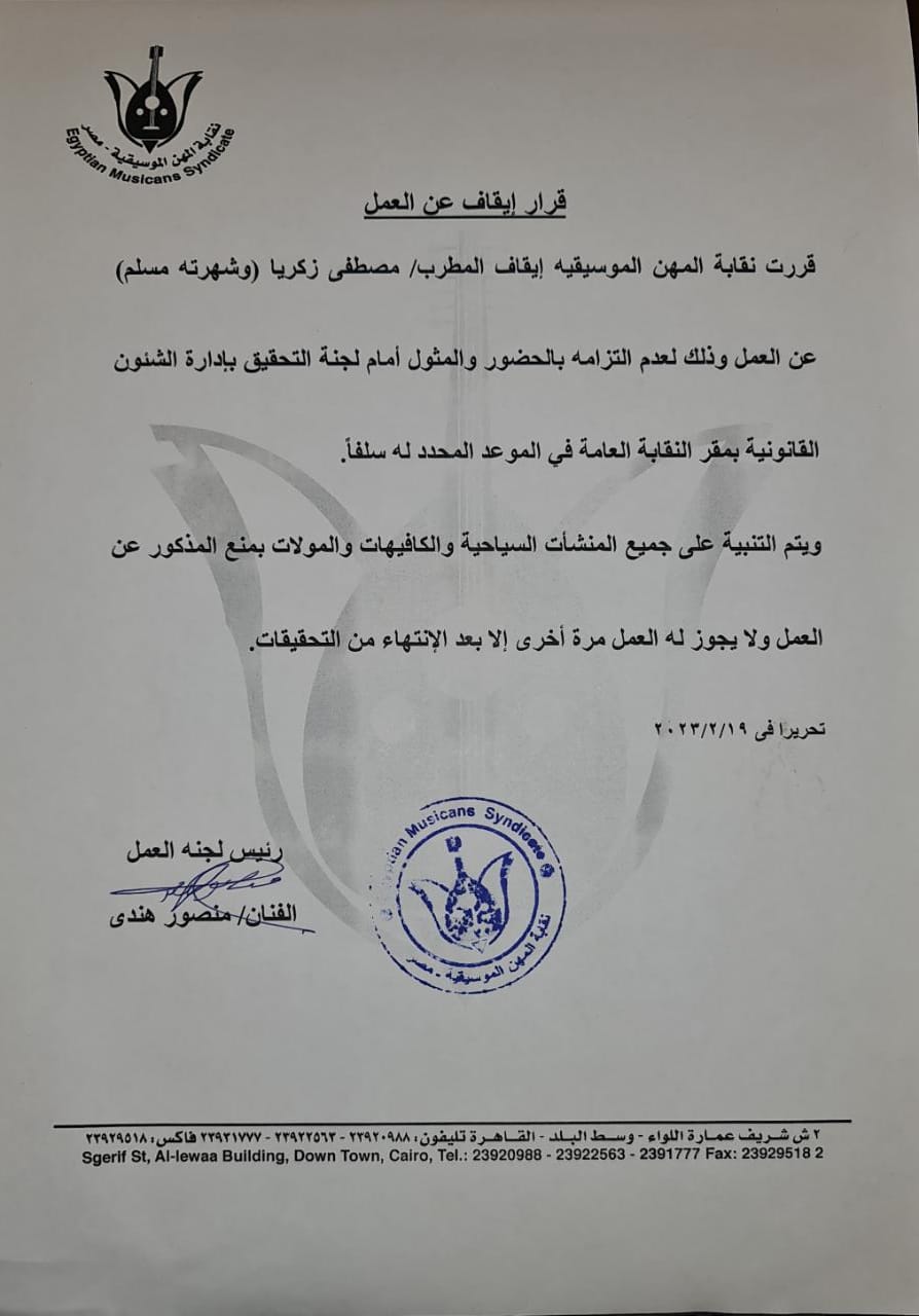 وجاء بيان النقابة كالتالي:قررت نقابة المهن الموسيقية إيقاف المطرب مصطفى زكريا وشهرته مسلم عن العمل وذلك لعدم التزامه بالحضور والمثول أمام لجنة التحقيق بإدارة الشئون العمل ولا يجوز له العمل مرة أخرى إلا بعد الإنتهاء من التحقيقات القانونية بمقر النقابة العامة في الموعد المحدد له سلفًا.