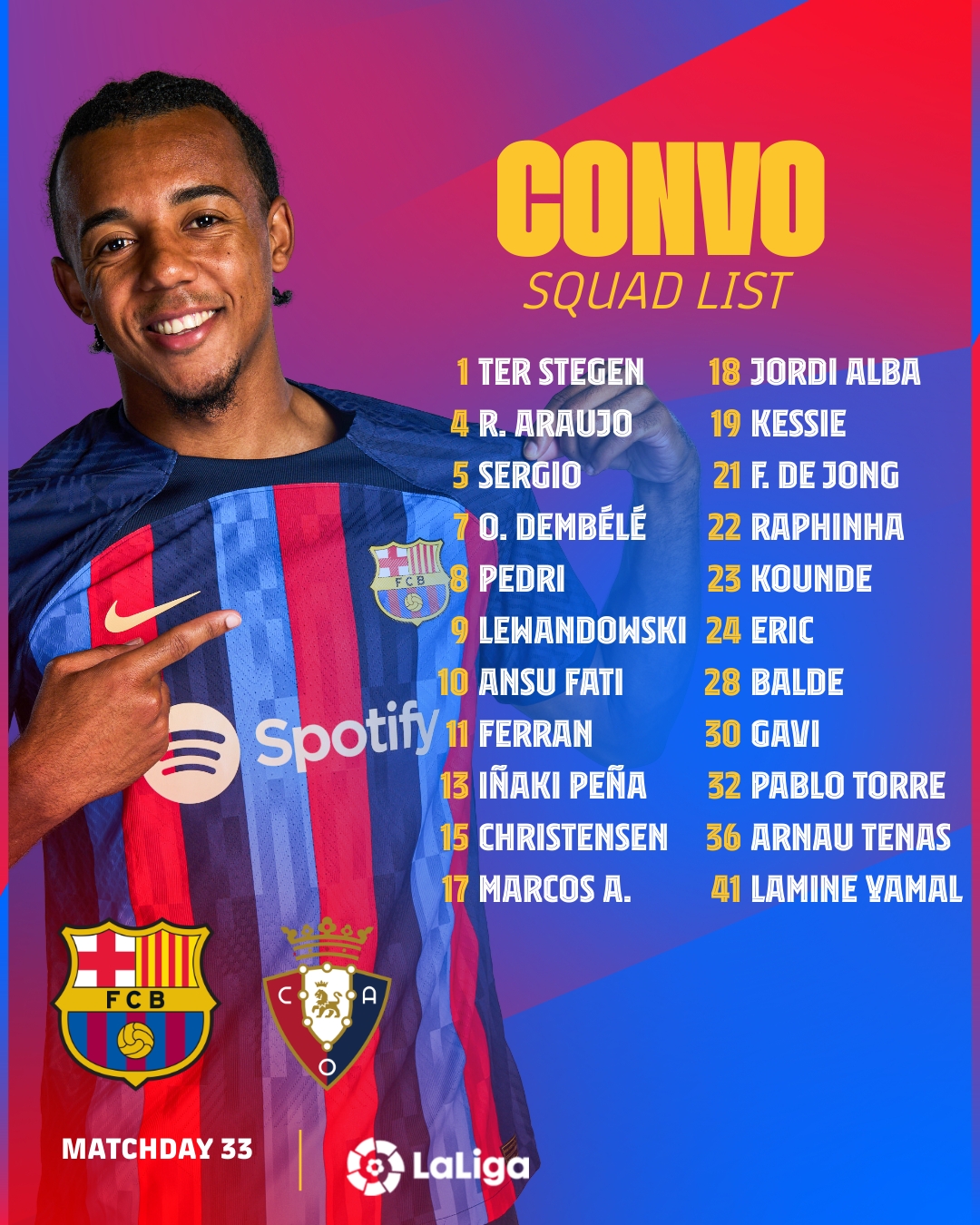 ويعتلي برشلونة ترتيب الدوري الإسباني 2022/2023 برصيد 79 نقطة، بينما يحتل فريق أوساسونا المركز التاسع في ترتيب الليجا الإسبانية برصيد 44 نقطة.