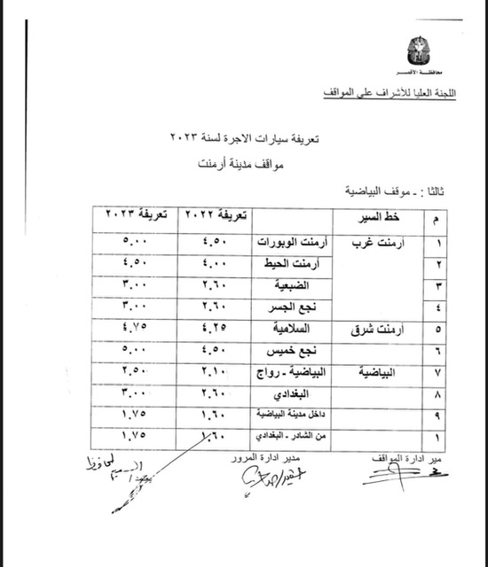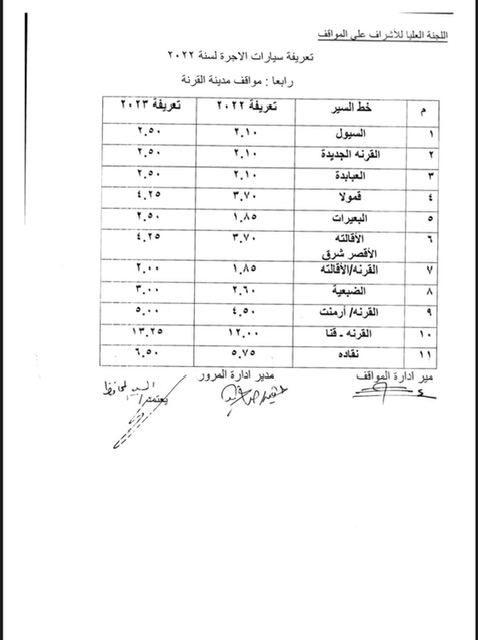 وتبدأ العمل بتعريفات الركوب الجديدة في المواقف من اليوم وسط متابعة وتعاون من رؤساء المدن والمرور ولجان الإشراف على المواقف بكافة مراكز المحافظة.