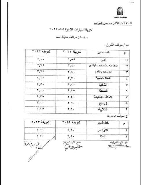 أعلنت اللجنة العليا للإشراف على المواقف إعتماد التعريفة الجديدة لسيارات الاجرة لمحافظة الأقصر لسنة 2023 بعد قرار لجنة التسعير التلقائي للمنتجات البترولية بتحريك أسعار السولار جنيها إضافيا لأول مرة منذ أكثر من عام.