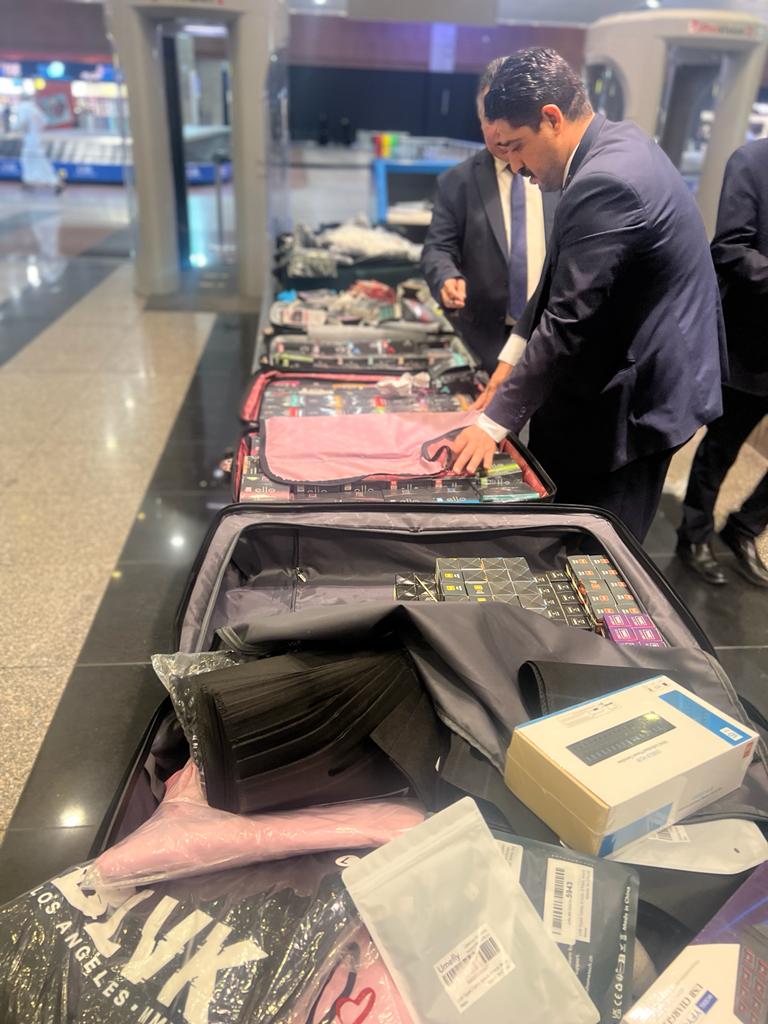 وبتفتيش حقائبهم تم ضبط 343 عبوة سيجارة إلكترونية ومستلزماتها مع الراكب الأول، و950 عبوة سيجارة إلكترونية ومستلزماتها مع الراكب الثاني وضبط 544 عبوة سيجارة إلكترونية ومستلزماتها مع الراكب الثالث بإجمالي 1837 عبوة سجائر الكترونية ومستلزماتها للركاب الثلاثة.
