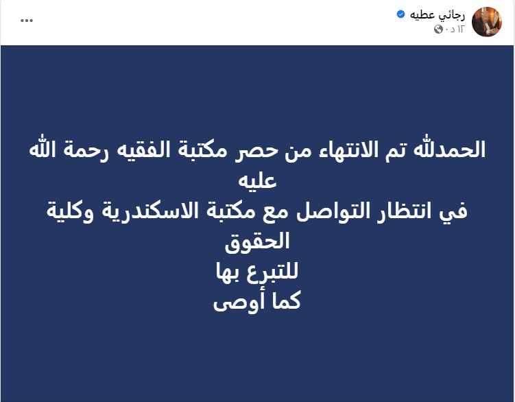 وجاء في نص المنشور الذي تناولته صفحة المحامي الراحل الرسمية بموقع التواصل الاجتماعي فيس بوك: الحمد لله تم الانتهاء من حصر مكتبة الفقيه رحمة الله عليه، وفي انتظار التواصل مع مكتبة الاسكندرية وكلية الحقوق، وللتبرع بها كما أوصى.