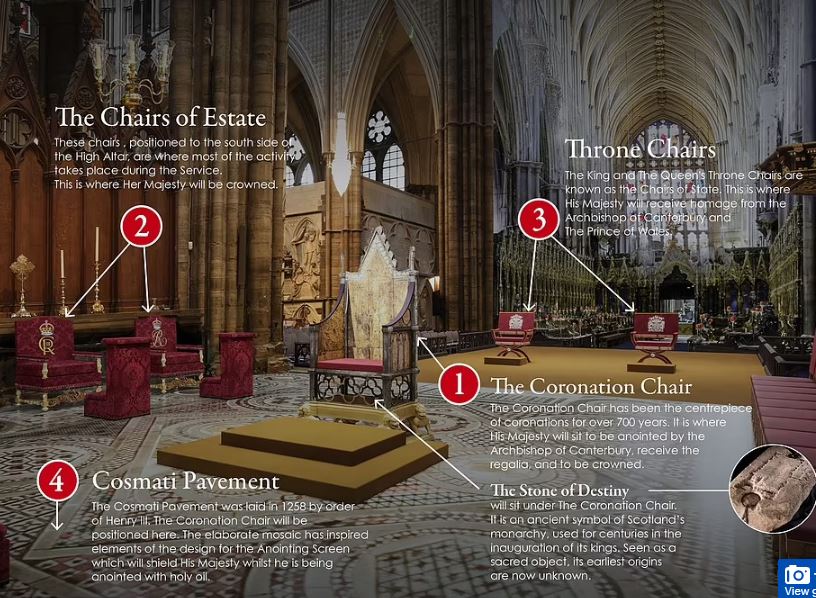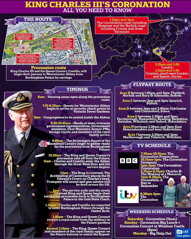 كما نشرت صحيفة ديلي ميل البريطانية خريطة لحفل التتويج وأماكن تحرك الملك تشارلز قبل دقائق من بدء الحفل، الذي سيبدأ في قصر بانجهام ثم إلى كنيسة وستمنستر آبي التي ستشهد حلف القسم.
