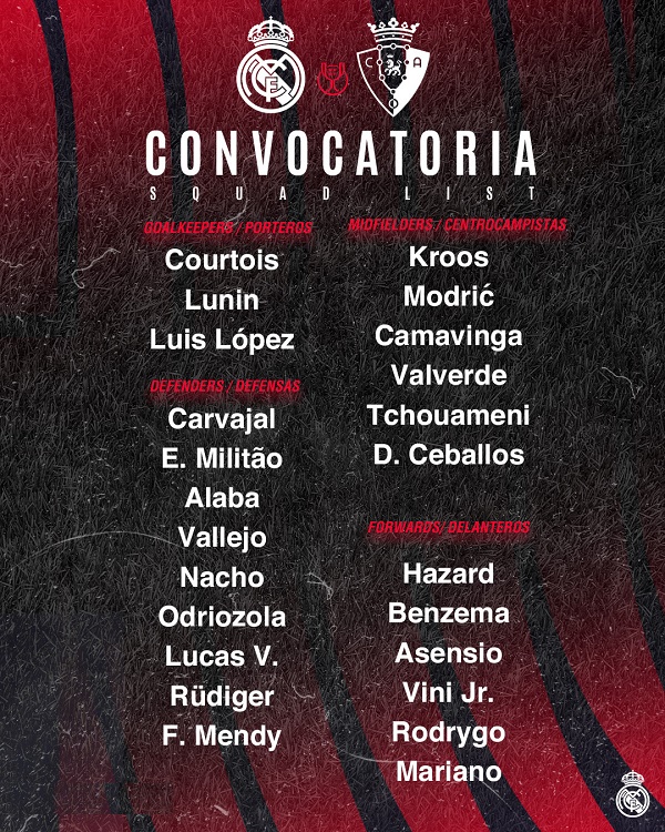 أعلن المدرب الإيطالي كارلو أنشيلوتي عن قائمة ريال مدريد لمواجهة أوساسونا اليوم في نهائي كأس ملك إسبانيا، ومن القائمة قد يختار تشكيل ريال مدريد التالي:
