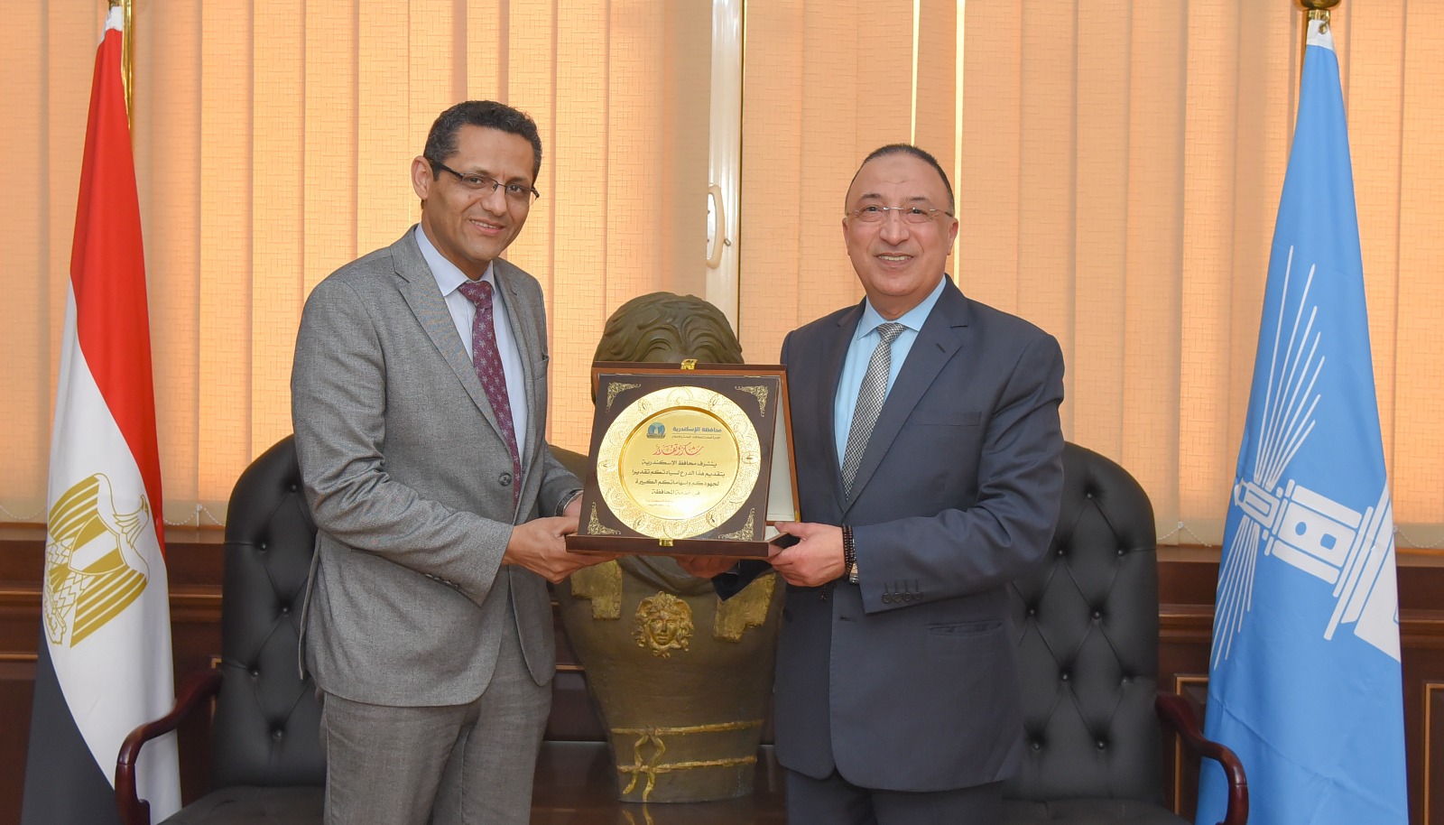 وفي نهاية اللقاء أهدي محافظ الإسكندرية درع المحافظة لنقيب الصحفيين تقديرًا لدور الصحافة والصحفيين.