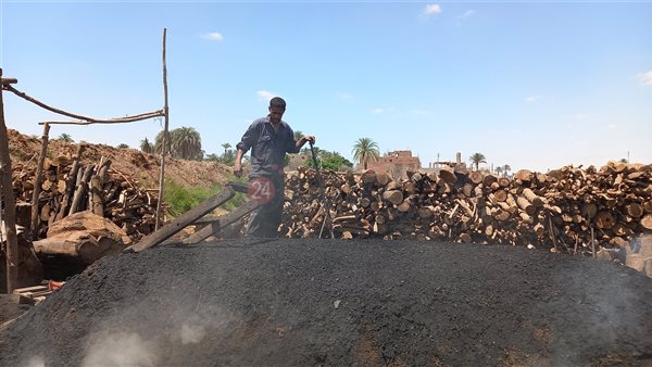 وأكمل أنه عقب فرز الخشب يتم رص الخشب بجانب بعضه وفوق بعضه حسب الأحجام، وغلق الفراغات بينهم، وعقب ذلك يتم تغطية الخشب بواسطة قش الرز ثم وضع طبقة من الطين المعجون بالمياه، وإشعال النيران فيه بالتدريج، ثم يتم نقل النار من مكان لآخر حتى يتم احتراق الخشب بالكامل ليصبح فحما.