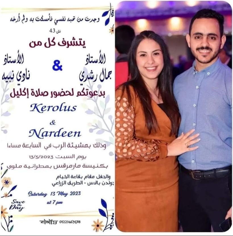 وقال أحد أقارب الشاب كيرلس ويدعي ماجد، أنه حفل زفافه كان السبت المقبل المواقف 13 مايو الجاري، مؤكدا أنه أنهي جميع الترتيبات الخاصة بحفل الزفاف استعدادا للعرس.