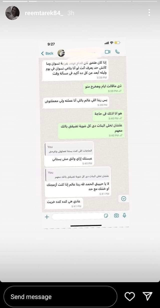 ونشرت ريم طارق شات بين زوجها حسن شاكوش سكرين لمحادثة بينها وبين زوجها على تطبيق واتساب، وذلك خلال ستوري على صفحتها الشخصية بموقع إنستجرام، لينتشر بعدها لقطة الشاشة بسرعة البرق بين رواد مواقع التواصل الاجتماعي، وأثير الجدل حول الأخطاء الإملائية التي ظهرت في المحادثة ورقم حسن شاكوش الذي نشرته ريم في الاستوري.
