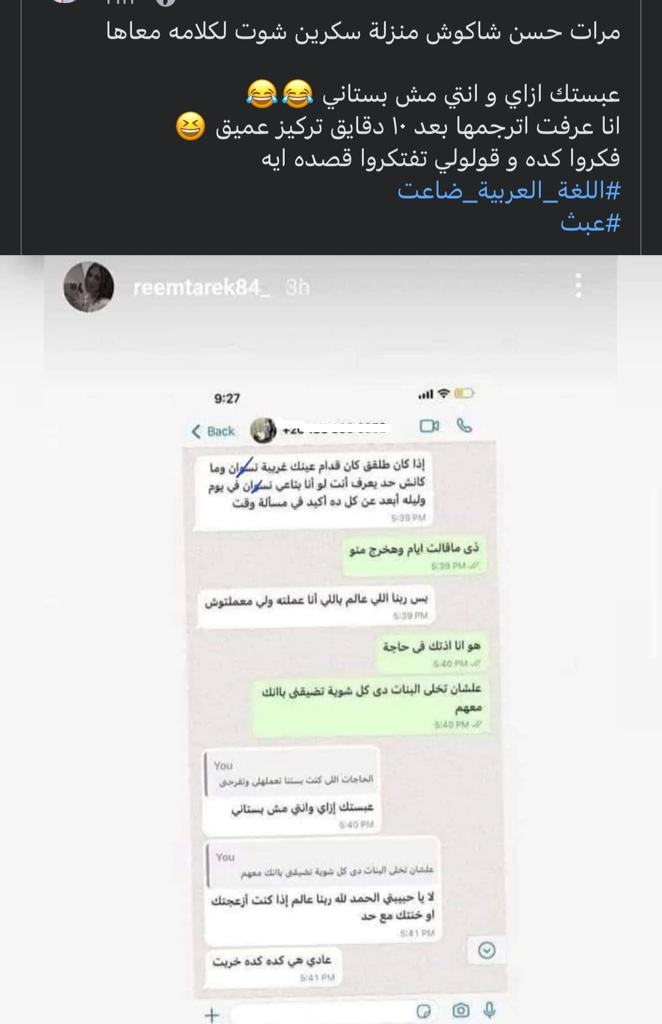 انتشر على مواقع التواصل الاجتماعي شات سكرين شوت بين حسن شاكوش وزوجته ريم طارق، وظهر خلال المحادثة بينهما العديد من الأخطاء اللغوية، التي أثارت حالة من الجدل الكبير بين رواد مواقع التواصل الاجتماعي، وتتصدر التريند منذ أمس.