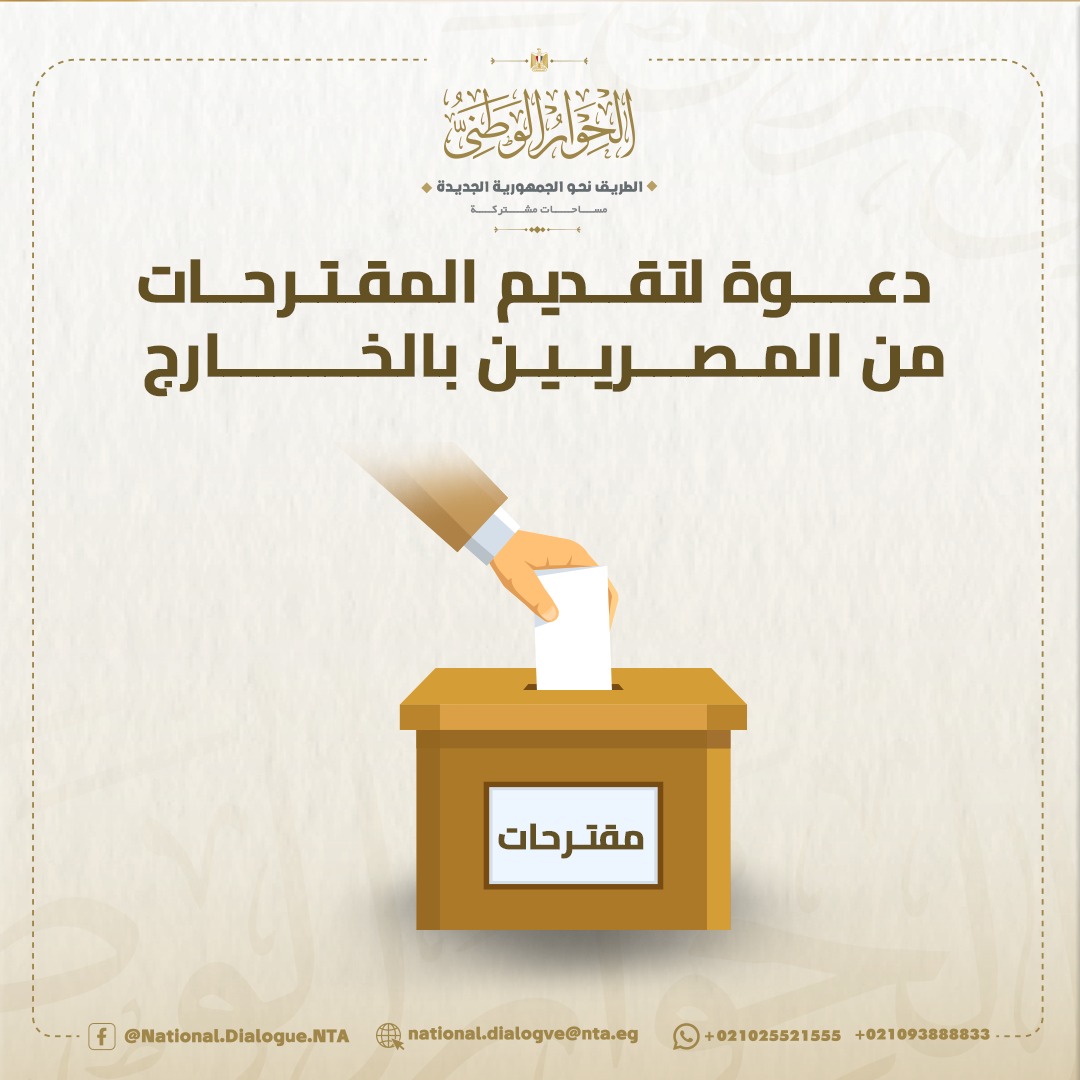 كما أشارت إلى أنه نظرًا لأن نافذة الحوار تطل على الجميع؛ تدعو إدارة الحوار الوطني المصريين في الخارج للمشاركة بمقترحاتهم والتحديات التي تواجههم ورؤيتهم في علاجها.