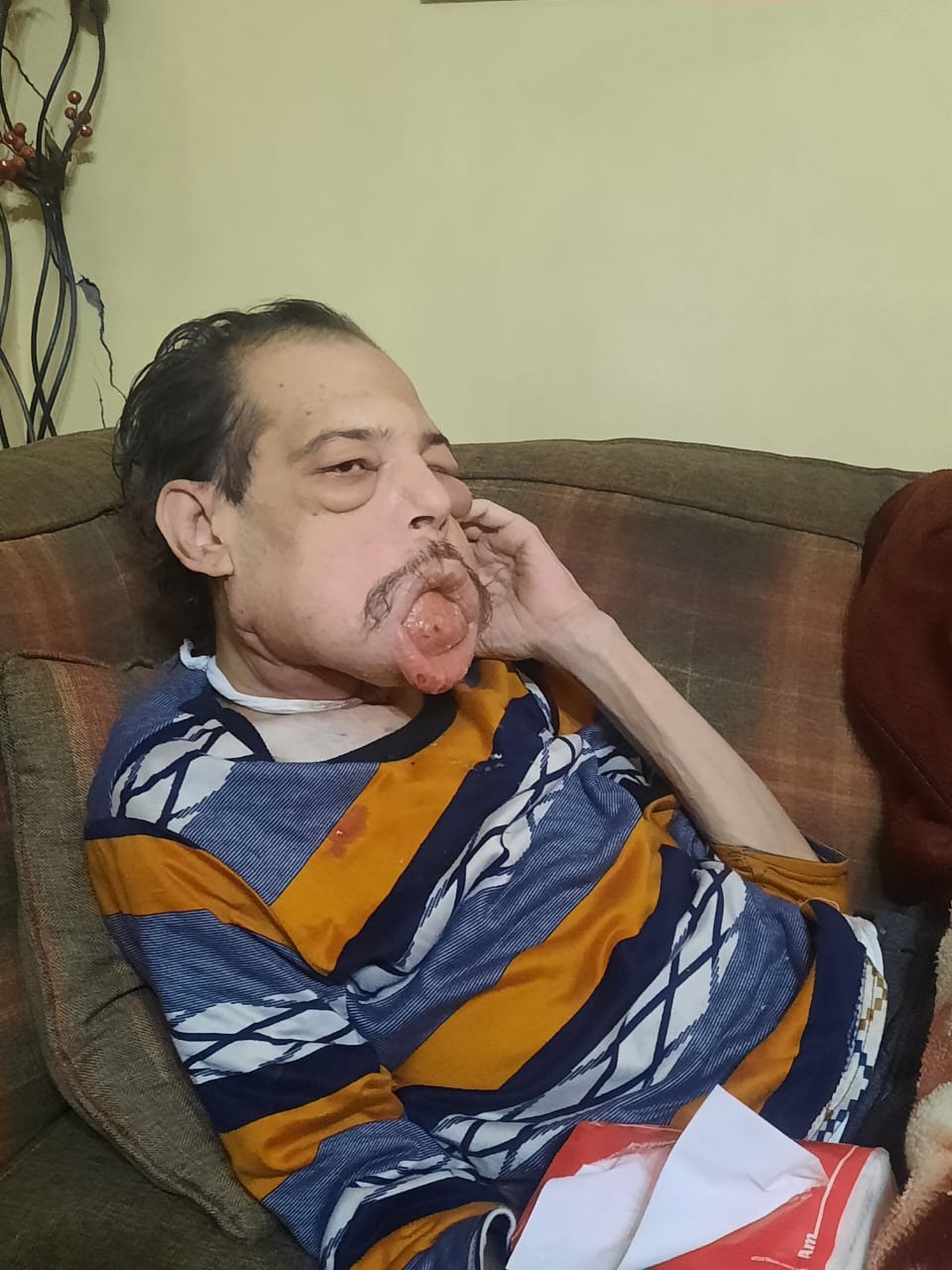 يعاني الحاج وليد، من عدة أمراض وتورم كبير باللسان والفم، بسبب خطأ طبي تعرض خلال إجراءه عملية تجميل تعرض لها العمليات التي أجراها على مدار 18 عاما في الرقبة بسبب التليفات التي كانت تصيبه.