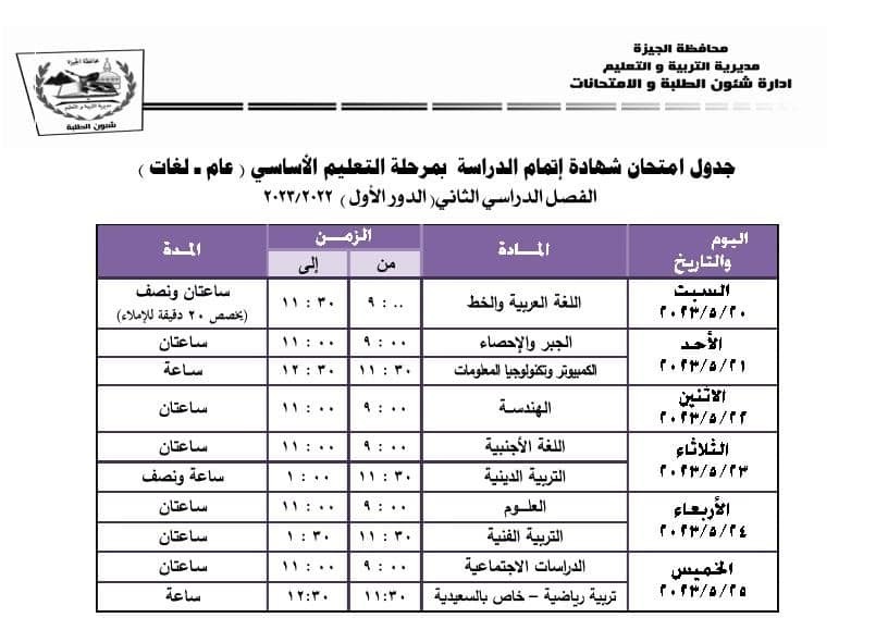 تنطلق امتحانات طلاب الشهادة الإعدادية للفصل الدراسي الثاني الدور الأول للعام الدراسي الحالي 2022-2023، بمحافظة الجيزة يوم 20 مايو بمادة اللغة العربية والخط.