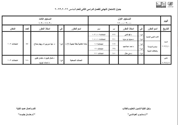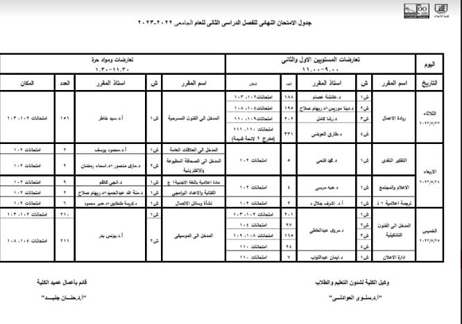 وكتبت الكلية عبر صفحتها الرسمية على موقع التواصل الاجتماعي فيسبوك، منشورًا، جاء مضمونه: إن هذه الجداول نهائية، مشددة على الطلاب بضرورة الالتزام بتعليمات امتحانات الفصل الدراسي الثاني.