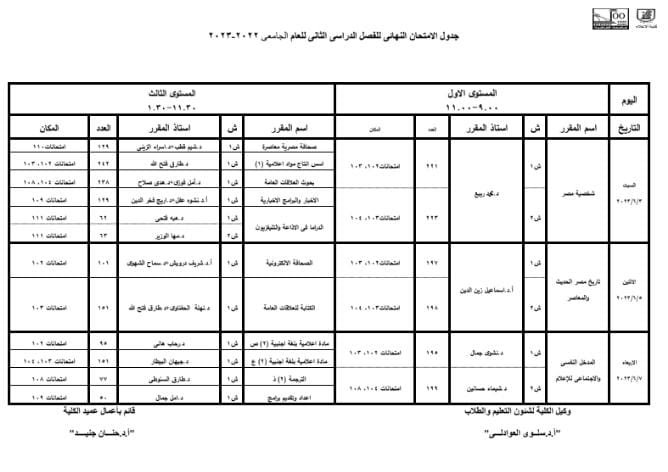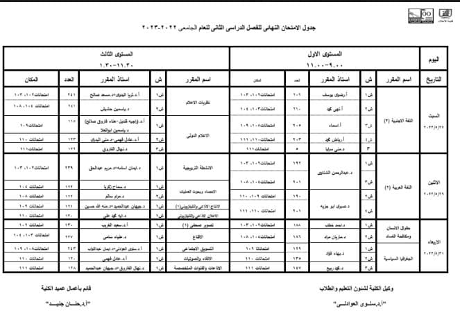جداول امتحانات نهاية العام 2023 لـ طلاب إعلام القاهرة