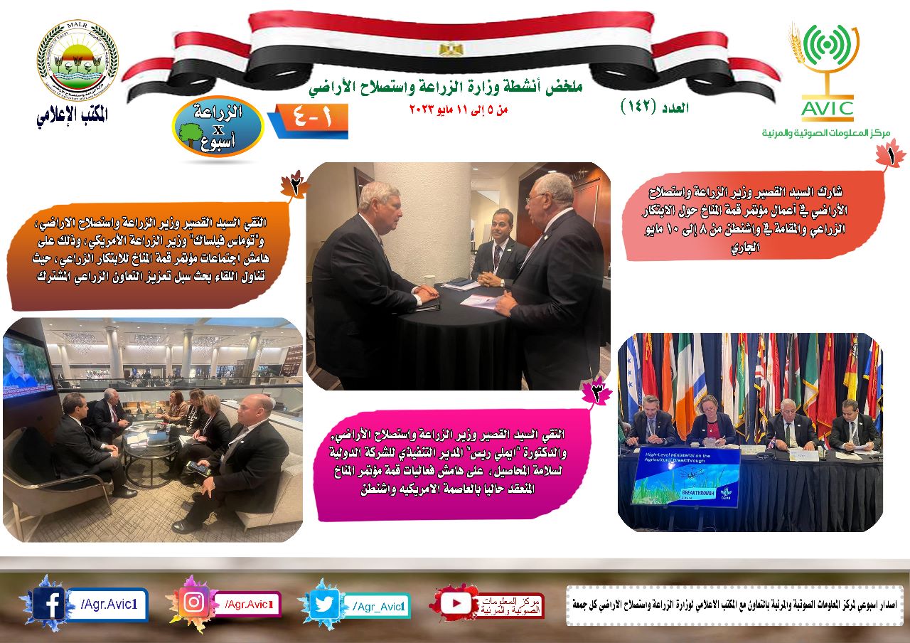 وسلط الإنفوجراف الضوء على مشاركة السيد القصير، وزير الزراعة واستصلاح الأراضي، في أعمال مؤتمر قمة المناخ حول الابتكار الزراعي والمقامة في واشنطن من 8 إلى 10 مايو الجاري، كما التقي القصير، وتوماس فيلساك وزير الزراعة الأمريكي، وذلك على هامش اجتماعات مؤتمر قمة المناخ للابتكار الزراعي، حيث تناول اللقاء بحث سبل تعزيز التعاون الزراعي المشترك، كما التقى أيضا الدكتورة إيملي ريس المدير التنفيذي للشركة الدولية لسلامة المحاصيل، على هامش فعاليات قمة مؤتمر المناخ المنعقد حاليا بالعاصمة الأمريكيه واشنطن.