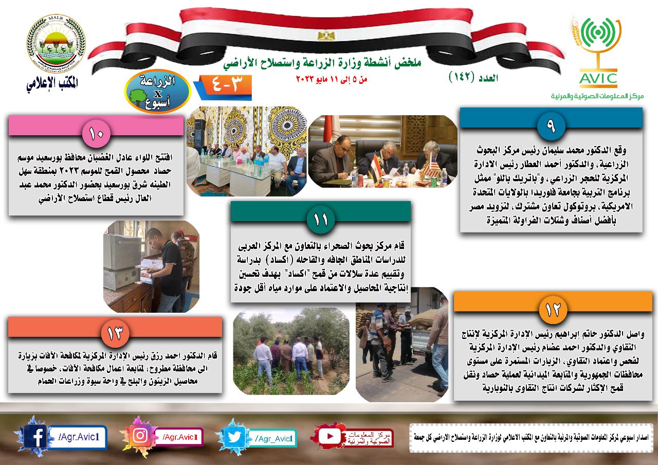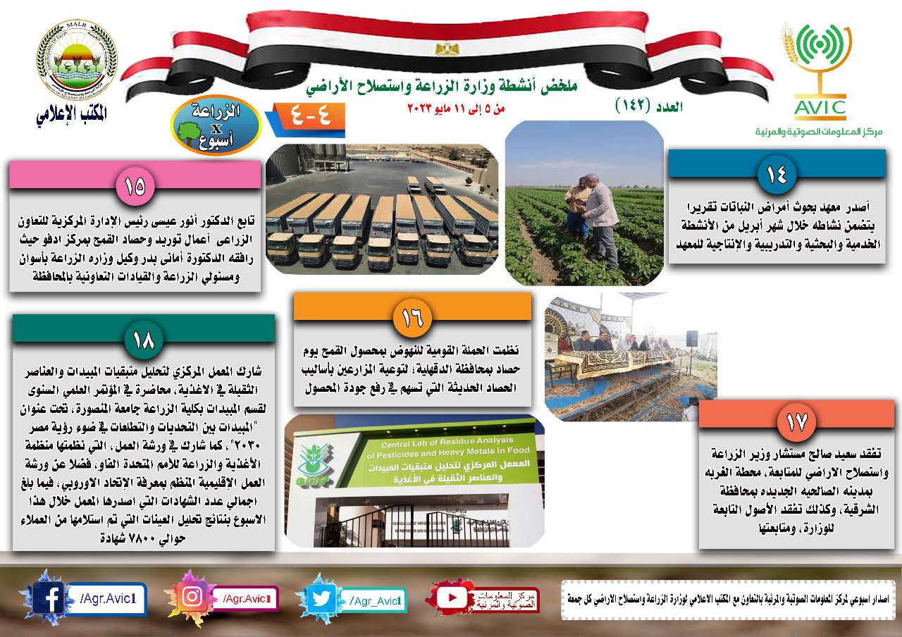 أصدر مركز المعلومات الصوتية والمرئية، التابع لوزارة الزراعة واستصلاح الأراضي، الإنفوجراف الأسبوعي في نسخته رقم 142، حول الحصاد الأسبوعي لأهم أنشطة الوزارة، خلال الأسبوع الماضي في الفترة من 5 إلى 11 مايو الجاري، وذلك بالتعاون مع المكتب الإعلامي للوزارة.