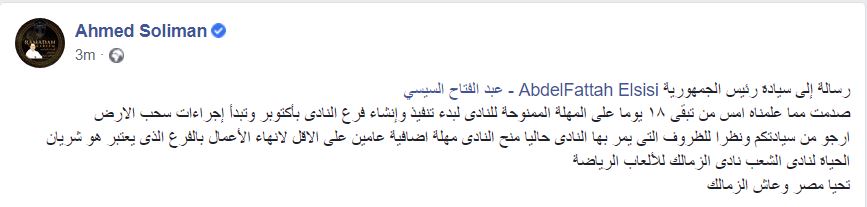 ونشر أحمد سليمان رسالة إلى سيادة رئيس الجمهورية عبد الفتاح السيسي، عبر حسابه الرسمي على موقع التواصل الاجتماعي فيس بوك، وجاءت كالتالي: صدمت مما علمناه أمس من تبقي 18 يومًا على المهلة للنادي لبدء تنفيد وإنشاء فرع النادي بأكتوبر وتبدأ إجراءات سحب الأرض، أرجو من سيادتكم ونظرًا للظروف التي يمر بها النادي حاليًا منح النادي مهلة على الأقل لإنهاء الأعمال بالفرع الذي يعتبر هو شريان الحياة لنادي الشعب نادي الزمالك للألعاب الرياضية، تحيا مصر وعاش الزمالك.