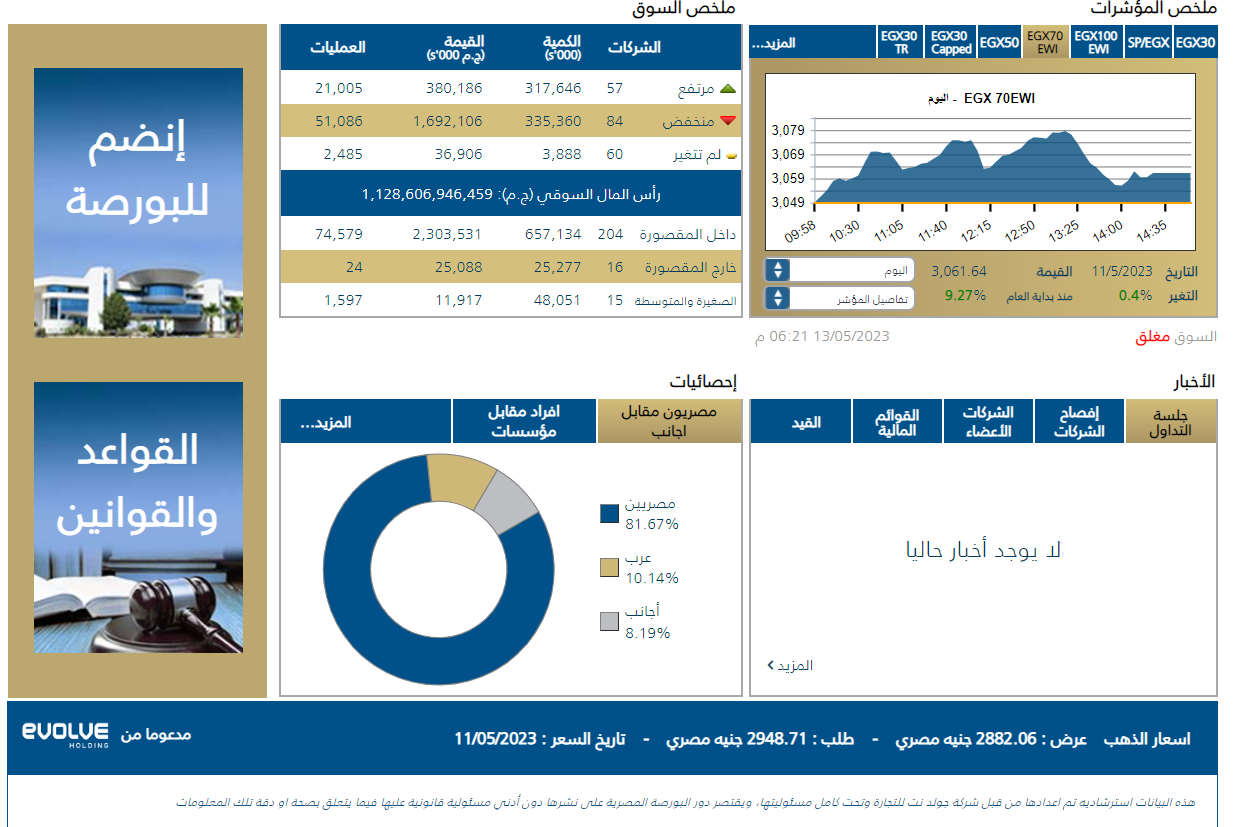 بدأت البورصة المصرية في الإعلان عن أسعار الذهب على موقعها الإلكتروني، بالتعاون مع شركة جولد نت للتجارة التابعة لشركة إيفولف للاستثمار القابضة المملوكة لرئيس البورصة الأسبق الدكتور سامح الترجمان.