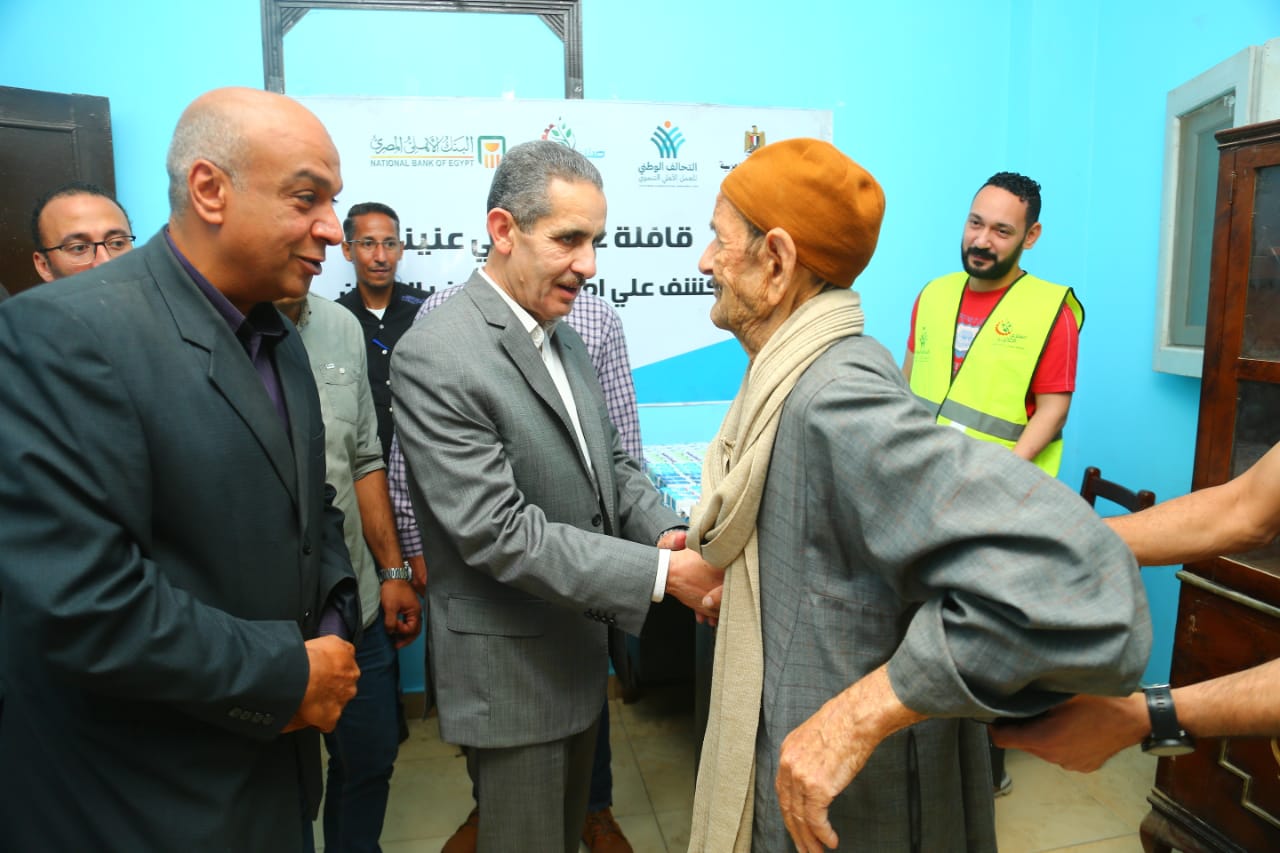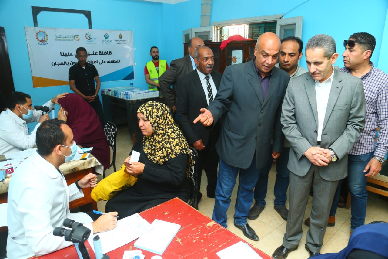 واستمع المحافظ خلال الزيارة لشرح تفصيلي عن الخدمات التي تقدمها القافلة كجزء من الخدمات التي تقدمها مبادرة عنيك في عنينا للحد من مسببات العمي تحت رعاية دولة رئيس مجلس الوزراء من توقيع الكشف الطبي على عيون المستفيدين وصرف العلاج وتشخيص الاحتياج لنظارات طبية تمهيدا لتسلميها، إلى جانب تشخيص الاحتياج لعمليات جراحية تمهيدا لا جراءها وذلك بالمجان تماما، فضلا عن التوعية بطرق الوقاية من الإصابة بأمراض العيون.
