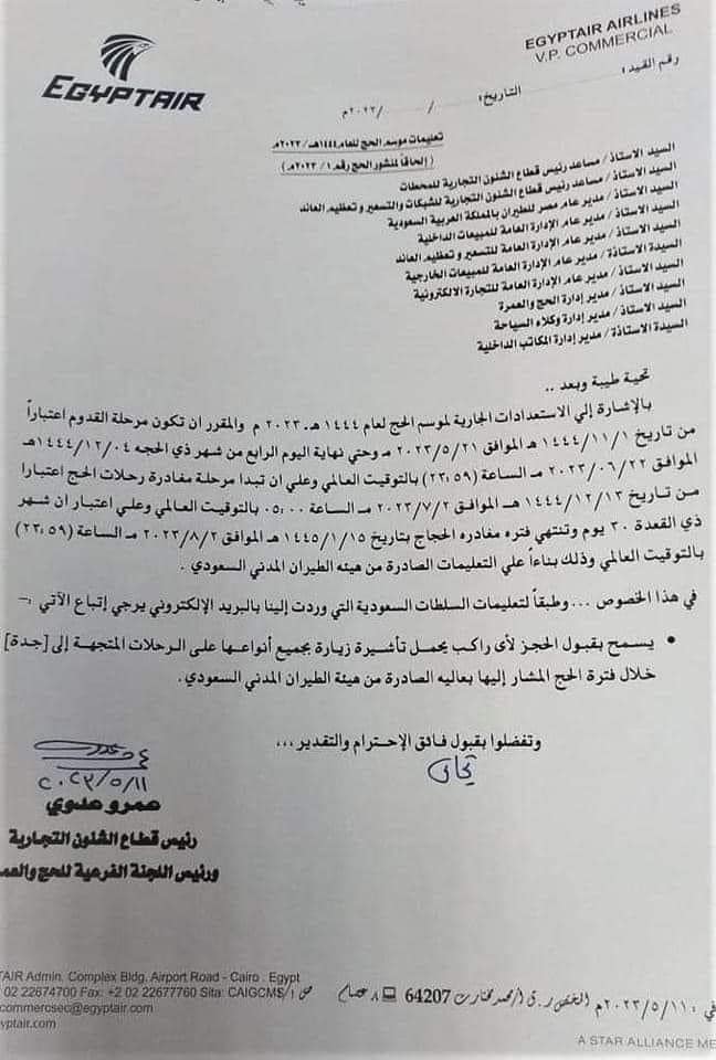 وحصل القاهرة 24 على نسخة من قرار شركة مصر للطيران بشأن موسم الحج كالتالي: