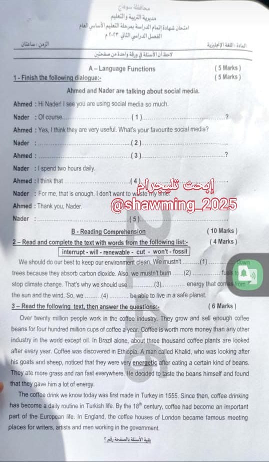 تداولت جروبات الغش باسم شاومينج عبر تطبيق تليجرام، اليوم الأحد، صورًا مزعومة لأسئلة امتحان اللغة الأجنبية لطلاب الشهادة الإعدادية 2023 في محافظة سوهاج، ضمن امتحانات نهاية العام للفصل الدراسي الثاني 2022-2023.