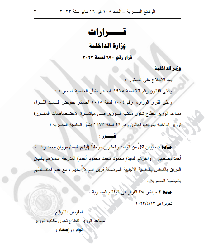 وجاء قرار وزير الداخلية الذي نشرته الجريدة الرسمية اليوم كالتالي: بعد الاطلاع على الدستور وعلى القانون رقم 26 لسنة 1975 الصادر بشأن الجنسية المصرية؛ وعلى القرار الوزاري رقم 1004 لسنة 2018 الصادر بتفويض اللواء مساعد الوزير لقطاع شئون مكتب الوزير في مباشرة الاختصاصات المقررة لوزير الداخلية بموجب القانون رقم 26 لسنة 1975 بشأن الجنسية المصرية تقرر ما يلي: