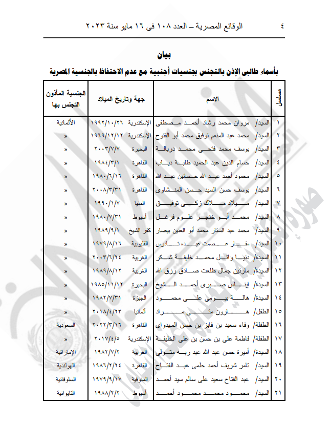 المادة الأولى: يُؤذن لكلِّ من الواحد والعشرين مواطنًا، أولهم مروان محمد رشاد - وآخرهم محمود محمد محمود أحمد، بالتجنس بالجنسية الأجنبية الموضحة قرين اسم كل منهم، مع سحب الجنسية المصرية.