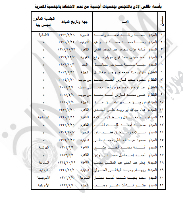 المادة الأولى: يُؤذن لكلِّ من الواحد والعشرين مواطنًا، أولهم أحمد راشد أحمد راشد - وآخرهم بيتر نشات منير وهيب، بالتجنس بالجنسية الأجنبية الموضحة قرين اسم كل منهم، مع سحب الجنسية المصرية.