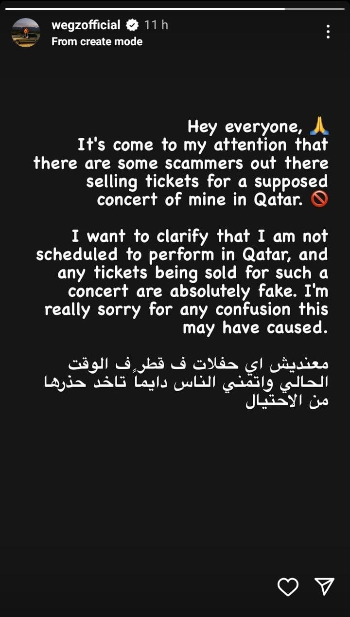 واختتم ويجز موجها رسالة لجمهوره: معنديش أي حفلات في قطر في الوقت الحالي، وأتمنى الناس دايما تاخد حذرها من الاحتيال.