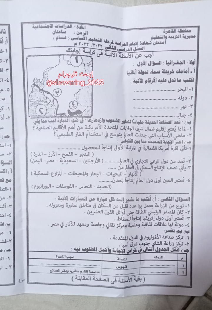 شاومينج يتداول صورًا مزعومة لأسئلة امتحان الدراسات الاجتماعية للشهادة الإعدادية بالقاهرة.. والتعليم تعلق